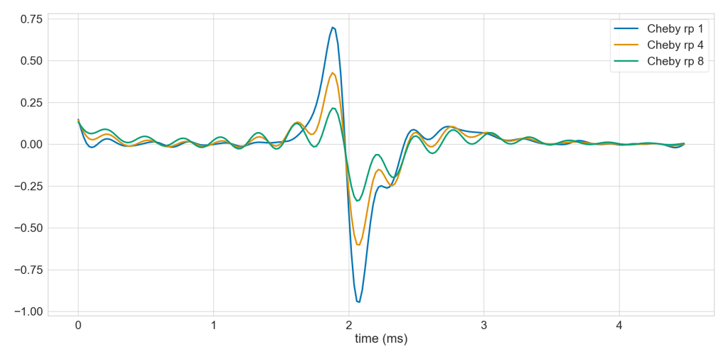 This can lead to distortions in the data depending on the size of the ripple. The Chebyshev type I filter takes an argument rp that defines the amount of pass band ripple that is tolerated in units of dB. The more ripple we tolerate, the steeper the roll off will be. Here you can see how large ripple causes oscillations in the data.