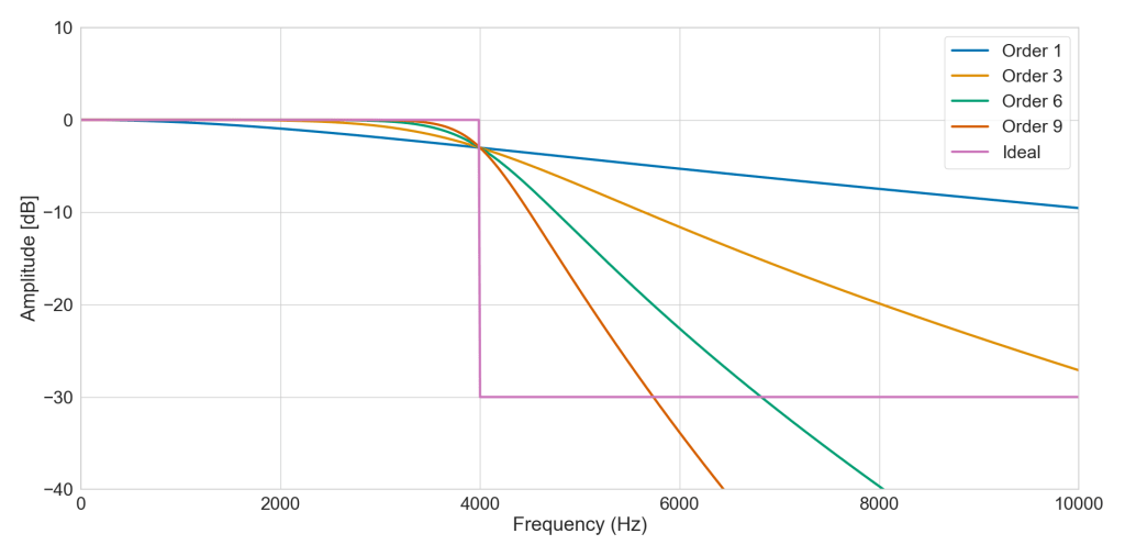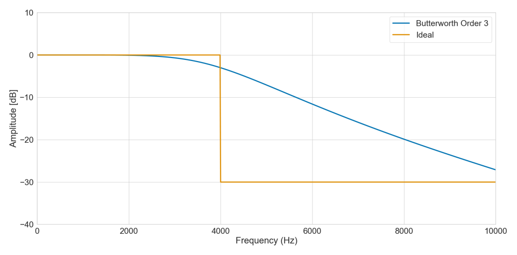 Ideally, we would like a filter response that falls down straight. Anything in the pass band is untouched, anything in the stop band is shutdown the same way. As you can see, our actual filter does no live up to the ideal. It already slightly attenuates signal that is part of the pass band and it falls much slower in the stop band. If we need a steeper roll off, we can increase the order of our filter.