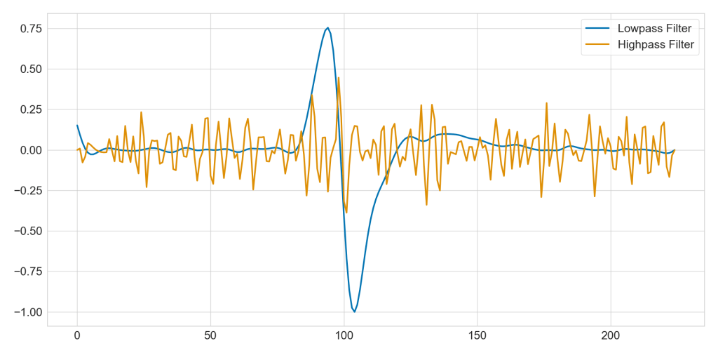 Signal filtering is a science on its own and I’ll focus on the practical aspects here and stick to two filter types: butterworth and Chebyshev type I. Each of those filters can be used for different purposes. We can use them as low pass, high pass, band pass or notch filters. Low pass filters leave low frequencies alone but attack high frequencies. High pass filters leave high frequencies alone but attach low frequencies. The title image shows an example of low and high pass filters used on the same data. Band pass filters leave a specific frequency band alone and attack all other frequencies. Notch filters attack a specific frequency band, leaving the rest alone. Let’s look at an example.