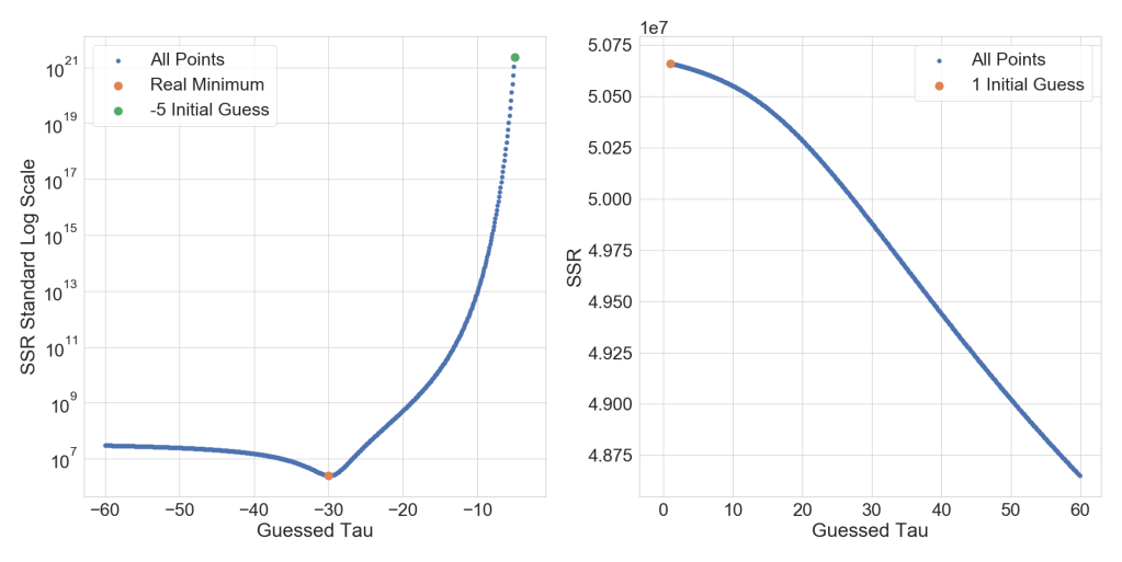 On the right side we get a picture of why optimization failed when we started at 1. There is no local minimum. The SSR just keeps decreasing with larger values of tau. That is why the tau was so larger when fitting failed (885223976.9). If we set our initial parameter anywhere in this part of the SSR landscape, this is where tau will go. Now there are other optimization methods that can overcome bad initial parameters. But few are completely immune to this issue.