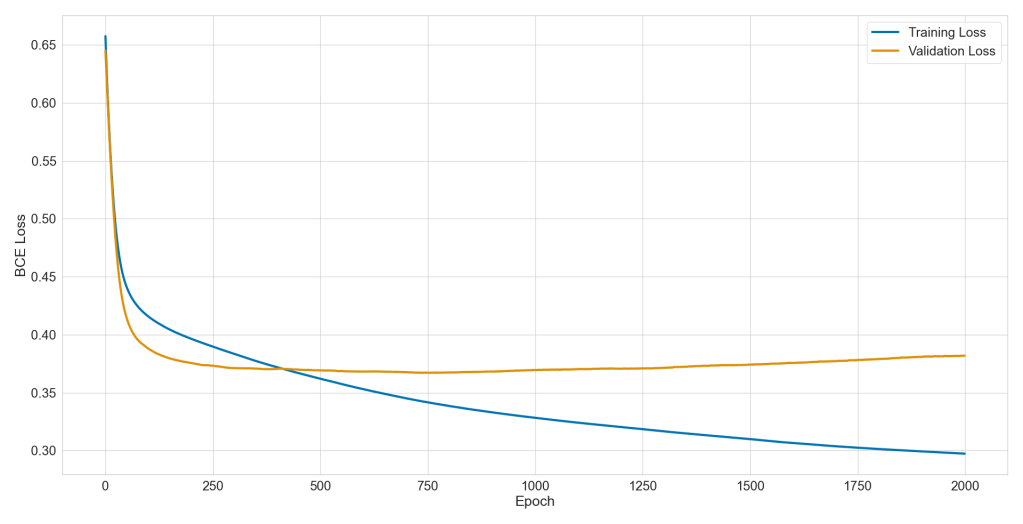 I will upload three different predictions to Kaggle. One from a network that is untrained. To do so I will set n_epochs to 0. This amounts to guessing, because the network is randomly initialized. Then I will upload predictions from a model that stops after 200 epochs. This should be a well trained model. Then I will use a model that stopped after 2000 epochs. This should be slightly overfit. Let’s see how we did.