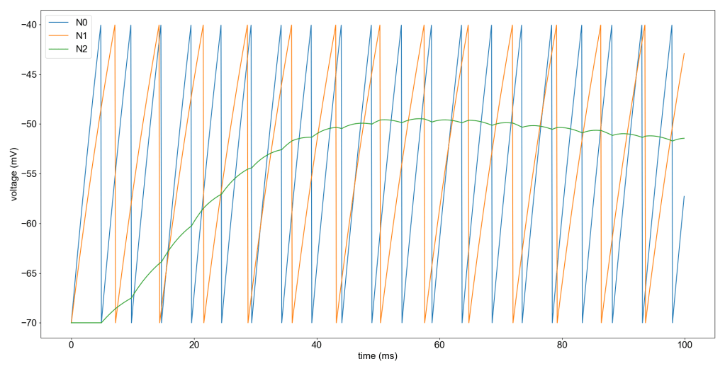 The first two neurons are regularly spiking. N0 is slightly faster because it receives a larger input current than N1. N2 on the other hand rests at -70mV because it does not receive an input current. When N0 spikes, it causes the voltage of N2 to increase as we expected, because N0 increases the excitatory conductance. N1 is not doing anything here, because its weight is set to 0. Continued activity of N0 eventually causes N2 to reach the threshold of -40mV, making it register its own spike and reset the voltage. What happens if we introduce the inhibitory weight?