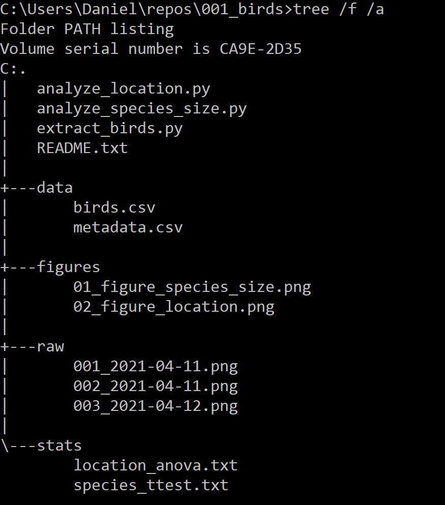 Now for the scripts themselves. Each script should have a very well defined input and output. extract_birds.py for example loops through all raw files in ./raw and creates the file ./data/birds.csv. The other two scripts both use that same birds.csv file but they answer different questions and have different outputs. analyze_location.py creates the figure 02_figure_location.png and the statistical output location_anova.txt. On the other hand analyze_species_size.py creates 01_figure_species_size.png and species_ttest.txt.