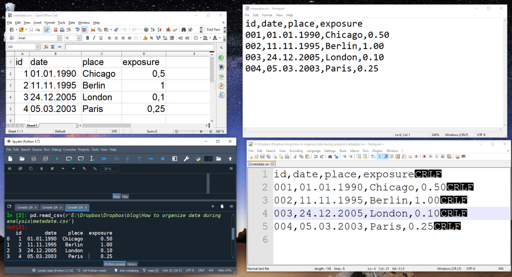 As researchers we often have to manage the entire data lifecycle from generation to the final report. Raw data are major parts of any analysis pipeline and it is important to properly store them. Many guidelines on data management focus on raw data but also stop there. However, raw data without analysis are pretty much worthless and there are major data management decisions to be made during analysis. Which intermediate results to save? What format? Where? Cloud storage? Do I build a database? Every decision will have effects in the actual analysis code and can determine how easy errors can be found and fixed. Here I want to give a detailed overview of the different options we have to organize our data during analysis. Python is my main programming language and this will be reflected here in that I prefer open source tools and I am not experienced with some of the commercial solutions that might exist. However, I will also cover the advantages/disadvantages of human-readable data formats and tools such as Microsoft Excel. We get started with raw data.
